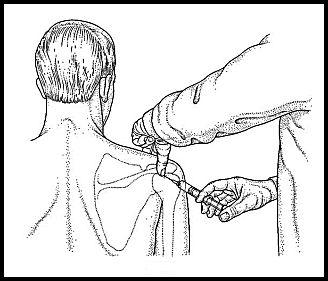 Μια άλλη τεχνική είναι η έγχυση κρυσταλλοειδούς διαλύματος στεροειδούς στο τενόντιο πέταλο. Στις περιοχές έγχυσης συμπεριλαμβάνεται το έλυτρο του τένοντα του δικεφάλου βραχιονίου στην πρόσθια επιφάνεια του ώμου, στον υπακρωμιακό θύλακα και στην κατάφυση του τένοντα του υπερακανθίου μυός στην άνω-έξω επιφάνεια, η περιοχή του ελάσσονος στρογγύλου, καθώς και ο θύλακας της άρθρωσης του ώμου. Δεν πρέπει να επαναλαμβάνεται η έγχυση πριν περάσουν 3-6 εβδομάδες, ούτε να γίνονται περισσότερες από 3 εγχύσεις. Μετά την έγχυση, ο ασθενής θα πρέπει σκύβοντας να κρεμάσει το χέρι και με αυτό χαλαρό να κάνει για ένα περίπου λεπτό κινήσεις αιώρησης εμπρός-πίσω και κυκλικές44.